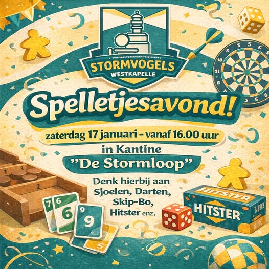 Op zaterdag 17 januari houden we vanaf 16:00 uur een gezellige spelletjesmiddag /-avond in kantine De Stormloop. Leden, niet-leden, jong en oud. Iedereen van harte welkom voor een spelletje, hapje en drankje.